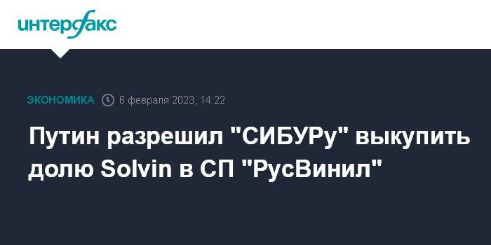 Москва. 6 февраля. INTERFAX.RU - "СИБУР" получил разрешение на выкуп 50%-ной доли в уставном капитале ООО "РусВинил" (Кстово) у компании Solvin Holding Nederland B.V. (подконтрольна бельгийской Solvay).