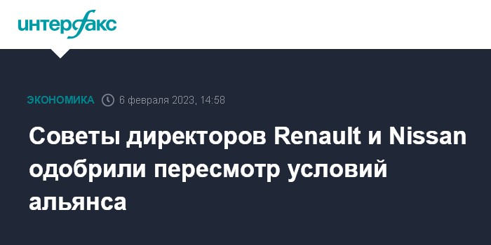 Москва. 6 февраля. INTERFAX.RU - Советы директоров японского автопроизводителя Nissan Motor Co. и французского концерна Renault SA одобрили соглашение о пересмотре условий двустороннего альянса, сообщила пресс-служба Renault.