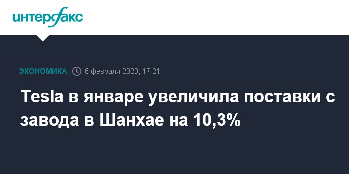 Москва. 6 февраля. INTERFAX.RU - Поставки с шанхайского завода Tesla в январе выросли на 10,3% относительно того же месяца прошлого года и составили 66 тысяч электромобилей, сообщила американская компания.