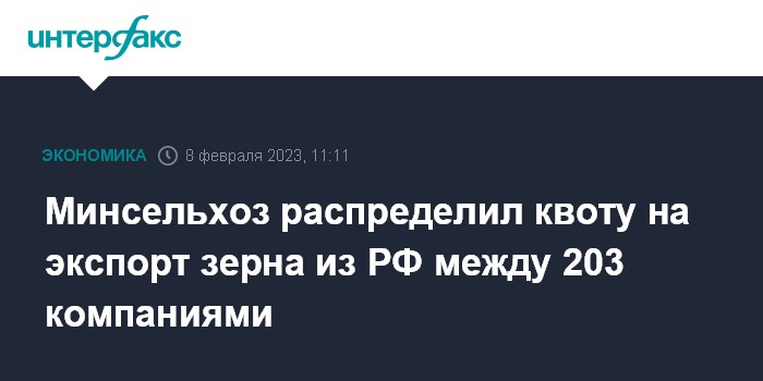 Москва. 8 февраля. INTERFAX.RU - Минсельхоз РФ распределил квоту на экспорт зерна между 203 компаниями. Это следует из приказа ведомства, размещенного в телеграм-канале Союза экспортеров зерна.