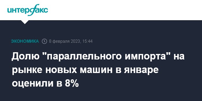 Москва. 8 февраля. INTERFAX.RU - В январе 2023 года "параллельный импорт" занял 8% в структуре продаж новых легковых автомобилей в России, подсчитало совместное предприятие оператора ЭПТС (АО "Электронный паспорт") и аналитического агентства "Автостат" - АО "Паспорт промышленный консалтинг" (ППК).