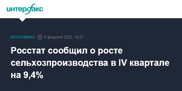 Москва. 8 февраля. INTERFAX.RU - В IV квартале 2022 года сельхозпроизводство в России выросло на 9,4% против 12,7% в III квартале, сообщил Росстат.