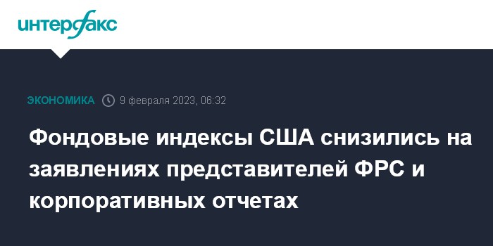 Москва. 9 февраля. INTERFAX.RU - Фондовые индексы США снизились в среду на заявлениях руководителей Федеральной резервной системы (ФРС), подтвердивших опасения рынка, что американский ЦБ не намерен останавливать повышение базовой процентной ставки.