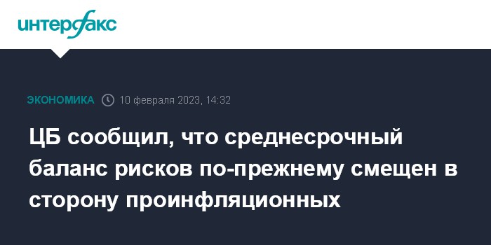 Москва. 10 февраля. INTERFAX.RU - Инфляционные риски на среднесрочном горизонте по-прежнему смещены в сторону проинфляционных, на краткосрочном горизонте проинфляционные риски вновь выросли и также преобладают над дезинфляционными, заявил Банк России после заседания по ставке.