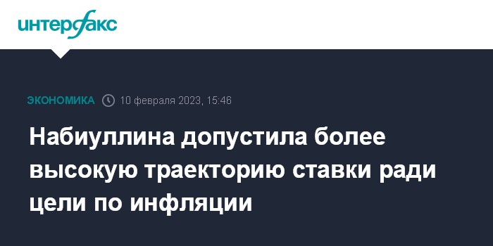 Москва. 10 февраля. INTERFAX.RU - Банку России для достижения прогноза по инфляции на 2023 год может потребоваться более высокая траектория ставки относительно октябрьских ожиданий, заявила председатель ЦБ Эльвира Набиуллина.