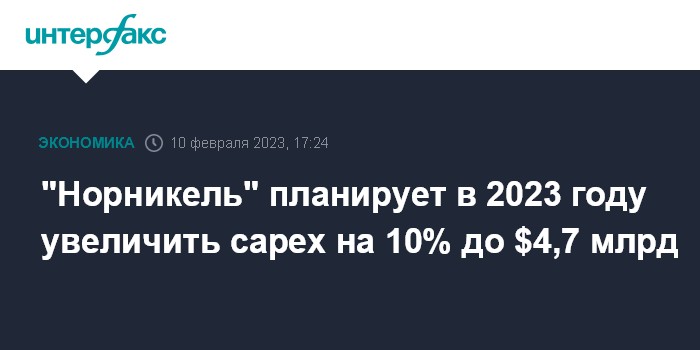 Москва. 10 февраля. INTERFAX.RU - "Норникель" планирует в 2023 году увеличить capex до $4,7 млрд, следует из презентации компании.