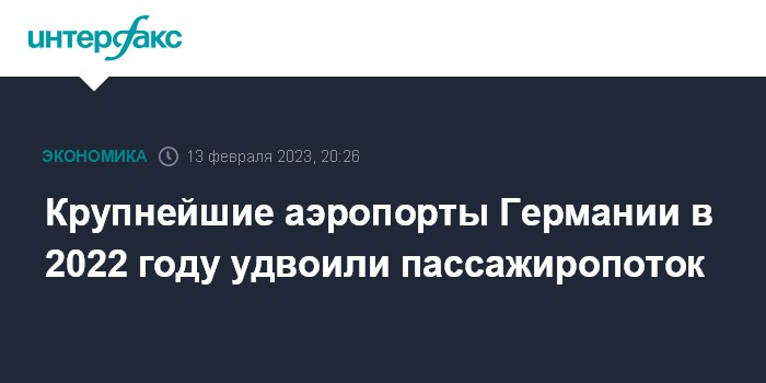 Москва. 13 февраля. INTERFAX.RU - Пассажиропоток в 23 крупнейших аэропортах Германии в 2022 году составил около 155,2 млн человек, свидетельствуют данные Федерального статистического управления страны (Destatis).