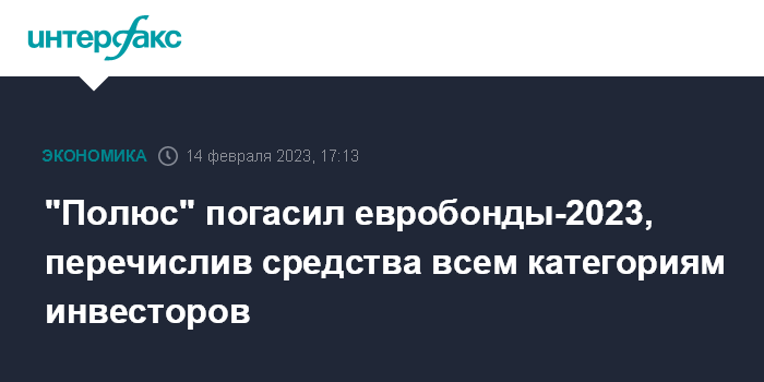 Эмитент евробондов, Polyus Finance Plc, перечислил оставшиеся денежные средства, зарезервированные для купонных выплат. Выплаты были запланированы на 7 августа 2022 года и на 7 февраля 2023 года. Также перечислена основная сумма долга по евробондам в адрес The Bank of New York Mellon, London Branch, действующего в качестве платежного агента по выпуску, говорится в сообщении "Полюса". По информации от платежного агента, средства были перечислены им в адрес международных клиринговых систем для последующей выплаты иностранным держателям евробондов, отмечает компания.
