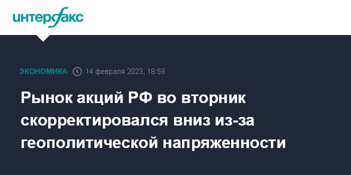 Москва. 14 февраля. INTERFAX.RU - Рынок акций РФ во вторник скорректировался вниз на фоне геополитической напряженности и ухудшения внешней конъюнктуры после выхода статистики о высокой инфляции в США в январе, что предполагает дальнейшее ужесточение монетарной политики Федрезервом.
