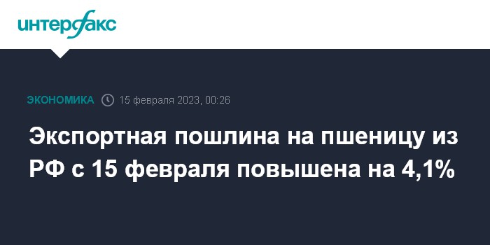 Экспортная пошлина на пшеницу из РФ с 15 февраля повышена на 4,1%