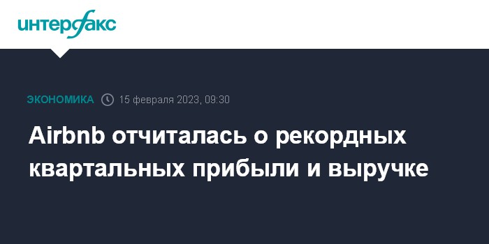 Москва. 15 февраля. INTERFAX.RU - В IV квартале 2022 года американский сервис бронирования жилья Airbnb Inc. увеличил чистую прибыль и выручку до рекордных значений и дал сильный прогноз на текущий квартал, благодаря чему акции компании резко выросли в цене.
