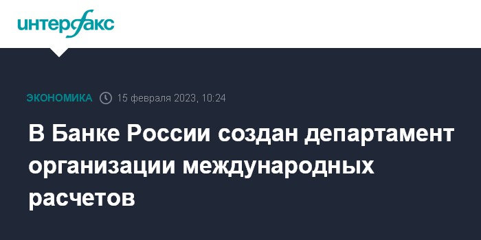 Москва. 15 февраля. INTERFAX.RU - Банк России создал новое структурное подразделение - департамент организации международных расчетов, который займется развитием корреспондентских отношений российских банков с контрагентами из дружественных стран, сообщила пресс-служба регулятора.