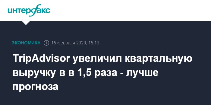 Москва. 15 февраля. INTERFAX.RU - В IV квартале 2022 года интернет-сервис для путешественников TripAdvisor Inc. увеличил выручку в 1,5 раза в годовом исчислении благодаря повышению активности в туристическом секторе.