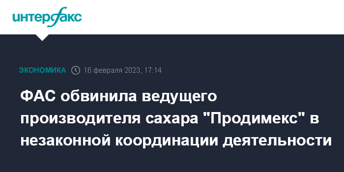 Москва. 16 февраля. INTERFAX.RU - Федеральная антимонопольная служба России (ФАС) обвинила ведущего производителя сахара в РФ - ГК "Продимекс" в незаконной координации экономической деятельности. Компания подала на службу в суд.