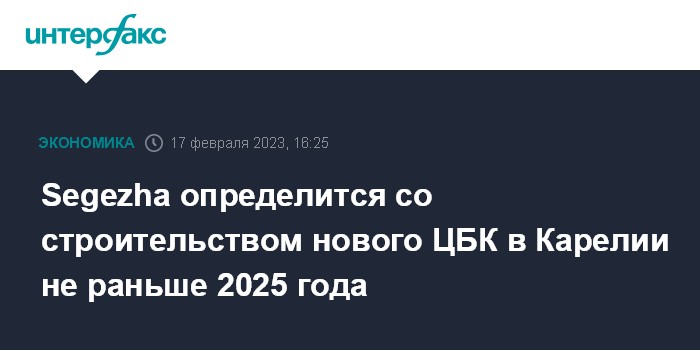 Москва. 17 февраля. INTERFAX.RU - Segezha Group примет решение о реализации проекта по строительству нового целлюлозно-бумажного комбината (ЦБК) в Карелии не раньше 2025 года, считают в администрации региона.
