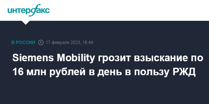 Москва. 17 февраля. INTERFAX.RU - Арбитражный суд Москвы 15 февраля решил в случае неисполнения Siemens Mobility GmbH (Германия) и ООО "Сименс мобильность" обязательств по договору о техобслуживании и ремонте высокоскоростных поездов, солидарно взыскивать с этих компаний в пользу ОАО "РЖД" 16,1 млн рублей неустойки за каждый день.