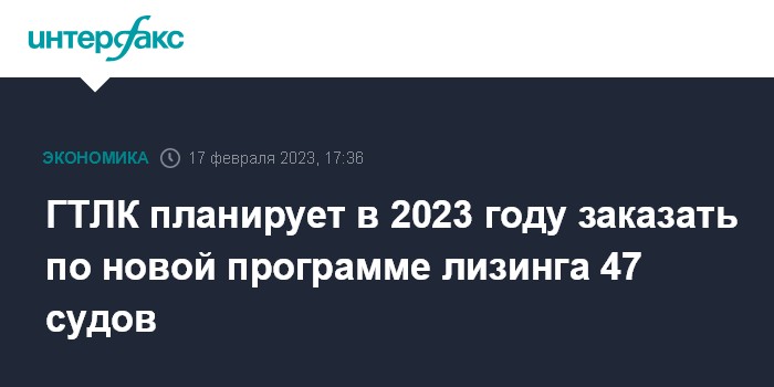 Москва. 17 февраля. INTERFAX.RU - АО "Государственная транспортная лизинговая компания" (ГТЛК) в 2023 году планирует заказать 47 судов по новой программе лизинга водного транспорта. Об этом сообщил генеральный директор ГТЛК Евгений Дитрих журналистам в Белокаменке в пятницу.