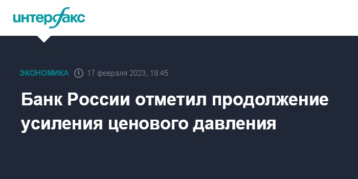 Москва. 17 февраля. INTERFAX.RU - Данные за первую половину февраля указывают на сохранение тенденции усиления ценового давления в России, проинфляционный эффект от ослабления рубля будет сказываться в ближайшие месяцы, говорится в опубликованном обзоре Банка России о динамике потребительских цен.