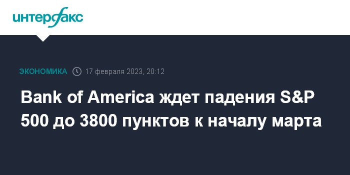 Москва. 17 февраля. INTERFAX.RU - Аналитики Bank of America прогнозируют падение фондового индекса S&P 500 до 3800 пунктов к началу марта, сообщает MarketWatch со ссылкой на пресс-релиз банка.