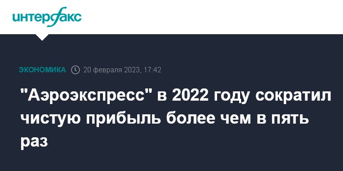 Москва. 20 февраля. INTERFAX.RU - ООО "Аэроэкспресс" закончило 2022 год с выручкой чуть более 4,9 млрд руб., что на 1,6% ниже, чем в 2021 году, чистая прибыль сократилась более чем в пять раз, следует из отчетности компании по РСБУ.