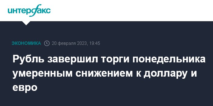 Как отмечают эксперты "Интерфакс-ЦЭА", рубль умеренно подешевел к доллару и евро по итогам торгов первого дня недели в условиях сниженной активности на мировом рынке. Биржи США закрыты в понедельник, так как в стране отмечают День президентов. Кроме того, участники внутреннего валютного рынка находятся в ожидании новых стимулов к движению.