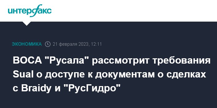 ВОСА "Русала" рассмотрит требования Sual о доступе к документам о сделках с Braidy и "РусГидро"