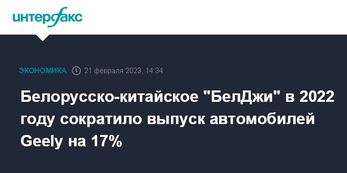 Москва. 21 февраля. INTERFAX.RU - Белорусско-китайское совместное предприятие "БелДжи" в 2022 году выпустило около 25 тысяч легковых автомобилей Geely, что на 17% меньше, чем в 2021 году.