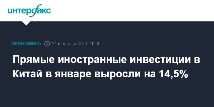 Москва. 21 февраля. INTERFAX.RU - В январе 2023 года объем прямых иностранных инвестиций (ПИИ, FDI) в экономику материкового Китая увеличился на 14,5% в годовом исчислении и составил 127,69 млрд юаней, сообщило "Синьхуа" со ссылкой на данные Министерства торговли страны.