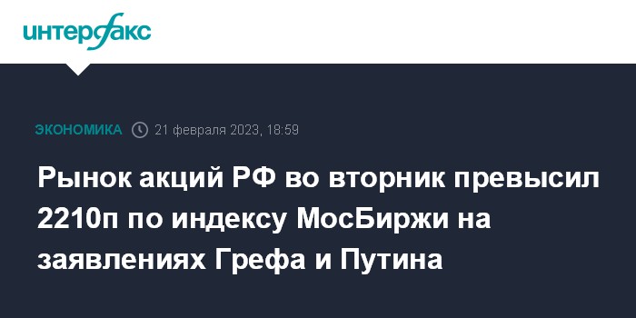 Рынок акций РФ во вторник превысил 2210п по индексу МосБиржи на заявлениях Грефа и Путина