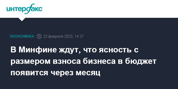 Москва. 22 февраля. INTERFAX.RU - Ясность с размером взноса, который крупным компаниям предстоит выплатить в бюджет из полученной благодаря ценовой конъюнктуре в 2021-2022 годах прибыли, может появиться только через месяц, сообщил журналистам статс-секретарь - заместитель министра финансов РФ Алексей Сазанов.
