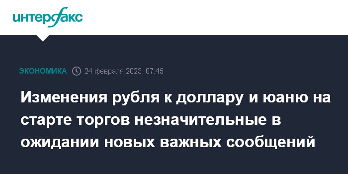 По мнению экспертов "Интерфакс-ЦЭА", рубль демонстрирует едва заметные изменения к доллару и юаню на старте торгов 24 февраля в ожидании новых драйверов. Участники рынка ждут важных сообщений, в том числе касающихся новых антироссийских санкций со стороны США и ЕС. Кроме того, ситуация на мировых рынках капитала в целом противоречивая и не дает четких сигналов для игры в ту или иную сторону. Активность торгов на внутреннем валютном рынке в пятницу пониженная в связи с официальным праздничным днем в России.