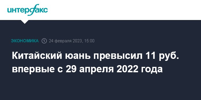 Москва. 24 февраля. INTERFAX.RU - Китайский юань в ходе торгов на Московской бирже в пятницу превысил 11 рублей впервые с 29 апреля 2022 года; рубль снижается в основных валютных парах на сообщениях относительно новых антироссийских санкций со стороны США и Европы.