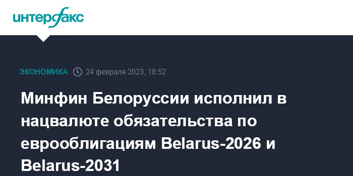 Москва. 24 февраля. INTERFAX.RU - Минфин Белоруссии в пятницу объявил об исполнении в белорусских рублях обязательств по еврооблигациям Belarus-2026 и Belarus-2031.