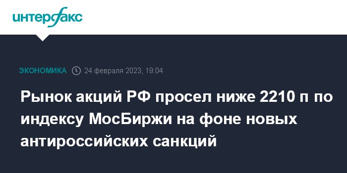 Москва. 24 февраля. INTERFAX.RU - Рынок акций РФ в пятницу просел на фоне ухудшения внешней конъюнктуры и новых антироссийских санкций Запада, подешевели бумаги компаний, попавшие в санкционные списки. Индекс МосБиржи опустился ниже 2210 пунктов, снижение сдерживалось резким ослаблением рубля. Выросли расписки TCS Group (+6,9%), поскольку банк не попал в санкционный список Великобритании.