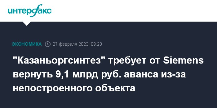 "Казаньоргсинтез" требует от Siemens вернуть 9,1 млрд руб. аванса из-за непостроенного объекта
