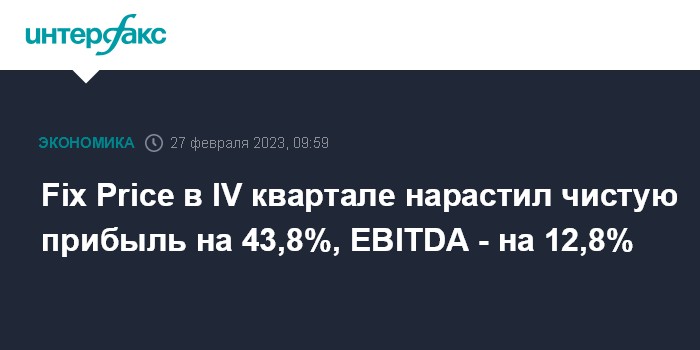 Москва. 27 февраля. INTERFAX.RU - Ритейлер Fix Price, управляющий крупнейшей в РФ сетью магазинов фиксированных цен, в IV квартале 2022 года нарастил чистую прибыль по МСФО на 43,8%, до 9,32 млрд рублей, говорится в отчете компании.
