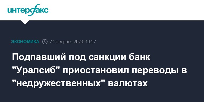Москва. 27 февраля. INTERFAX.RU - Банк "Уралсиб" с 27 февраля приостановил переводы клиентов – физлиц и юрлиц в девяти валютах.