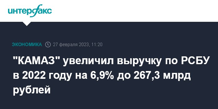 Москва. 27 февраля. INTERFAX.RU - Выручка ПАО "КАМАЗ" по РСБУ в 2022 году выросла на 6,9%, до 267,279 млрд рублей. Об этом сообщил гендиректор компании Сергей Когогин на заседании горсовета Набережных Челнов 24 февраля.