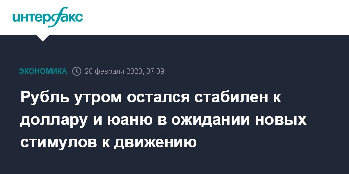 Москва. 28 февраля. INTERFAX.RU - Доллар США и юань стабильны на Московской бирже на старте торгов во вторник, рубль не изменился в ожидании новых стимулов к движению.