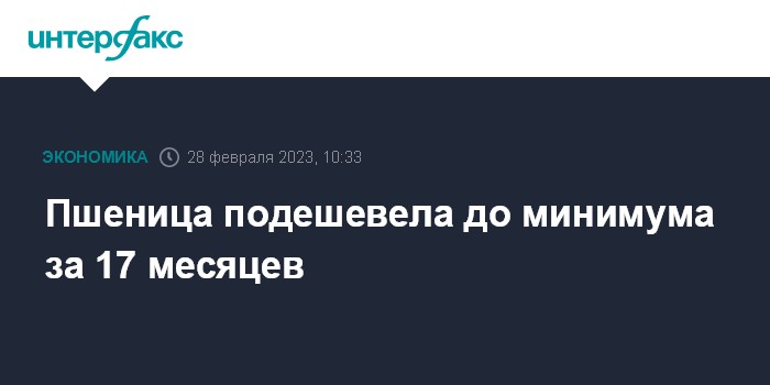 Москва. 28 февраля. INTERFAX.RU - Цены на пшеницу в понедельник упали до минимального уровня с сентября 2021 года на ослаблении опасений по поводу поставок в краткосрочной перспективе.