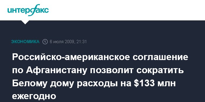 Москва. 6 июля. INTERFAX.RU - Российско-американское соглашение о военном транзите в Афганистан позволит ВВС США совершать 4,5 тыс. вылетов в год без дополнительных затрат, что позволит Белому дому сэкономить на топливе и других транспортных расходах до $133 млн ежегодно, пишет в понедельник американское издание "Вашингтон пост" со ссылкой на заявление представителя Белого дома.