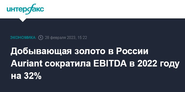 Москва. 28 февраля. INTERFAX.RU - Шведская Auriant Mining, добывающая золото в России, сообщила, что по итогам 2022 года получила $15,4 млн EBITDA. Это на 32% меньше результата 2021 года.