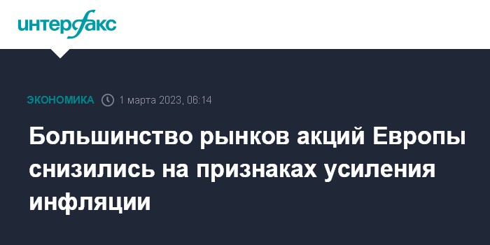 Москва. 1 марта. INTERFAX.RU - Фондовые индексы большинства крупнейших стран Западной Европы во вторник снизились на признаках усиления инфляции в еврозоне.