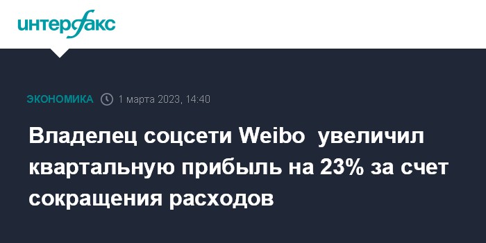 Москва. 1 марта. INTERFAX.RU - В IV квартале 2022 года Weibo Corp., владелец крупнейшей социальной сети в Китае, увеличил чистую прибыль благодаря усилиям по сокращению расходов, позволившим компенсировать падение рекламных доходов.