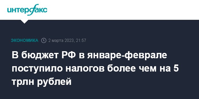 "За 2 месяца 2023 года в бюджетную систему РФ поступило более 5 трлн рублей налоговых доходов, что превышает аналогичный показатель прошлого года.
