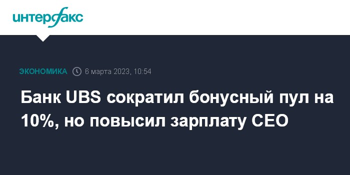 Москва. 6 марта. INTERFAX.RU - UBS Group AG, крупнейший банк Швейцарии, сократил пул премиальных выплат по итогам 2022 года на 10% на фоне снижения выручки, однако увеличил размер вознаграждения главному исполнительному директору.