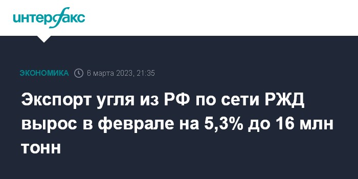 Москва. 6 марта. INTERFAX.RU - Экспорт угля из РФ по сети ОАО "Российские железные дороги" (РЖД) вырос в феврале 2023 года на 5,3% по сравнению с тем же месяцем прошлого года, составив 16 млн тонн.