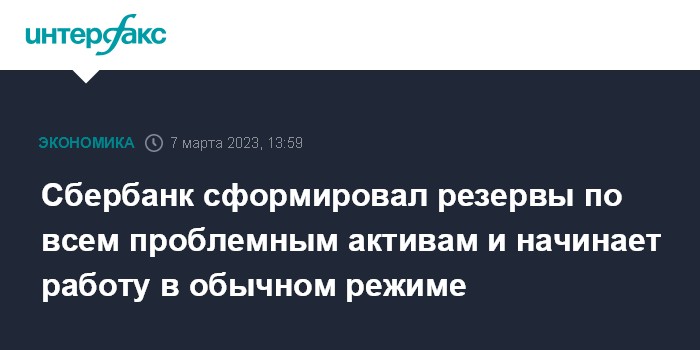Москва. 7 марта. INTERFAX.RU - Сбербанк сформировал резервы по всем проблемным активам, начинает работать в обычном режиме, сообщил президент - председатель правления банка Герман Греф в ходе рабочей встречи с президентом РФ Владимиром Путиным.