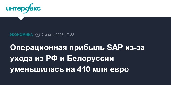 Москва. 7 марта. INTERFAX.RU - Негативное влияние прекращения деятельности германской SAP (мировой производитель ПО для управления предприятиями) в России и Белоруссии в 2022 году составило около 410 млн евро, говорится в годовом отчете компании по МСФО.