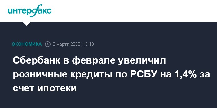Москва. 9 марта. INTERFAX.RU - Сбербанк в феврале увеличил розничный кредитный портфель по РСБУ на 1,4%, в основном благодаря ипотеке, которая выросла за месяц на 1,8%, говорится в пресс-релизе кредитной организации.